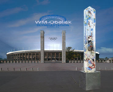 Aus Begeisterung über die Weltmeisterschaft 2006 in Deutschland hat Hella De Santarossa einen ca. neun Meter hohen WM-Obelisken 2006 kreiert, der vor dem Olympia- Stadion in Berlin aufgestellt werden soll. Diese Leucht- skulptur ist ein Symbol der weltweiten freudigen Völker- verständigung. Sie wird mit Sportlerinsignien wie von WM-Sportlern signierten Trikots, Fußballerschuhen, Socken und Fußbällen mittels einer speziellen Konservierung gefüllt und stellt somit eine dauerhafte Erinnerung an die Fußball- Weltmeisterschaft 2006 dar.